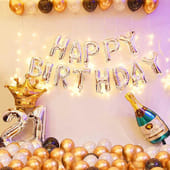 Unveil the extraordinary with this captivating balloon ensemble, designed to elevate every birthday celebration. Crafted to perfection, this masterpiece boasts 30 enchanting Golden Chrome Balloons intertwined with the shimmer of 15 Silver and 15 Black Metallic Balloons. This arrangement is further adorned with gleaming "Happy Birthday" letter foil balloons, 2 elegant silver digit foil balloons, a Champagne Bottle Foil Balloon, and a majestic Crown Foil Balloon. The highlight of this setup is the star LED curtain that serves as the perfect backdrop for this exciting occasion, ensuring your loved ones feel truly special and cherished.