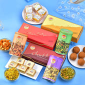 This grand assortment brings together a rich mix of Chhappan Bhog favourites, including Mewa Batisa, Besan Laddoo, Chocobites, Pudina Dalmoth, Cornflakes Dalmoth and Kaju Dalmoth. Each treat adds its own charm, from classic mithai indulgence to crisp, flavourful namkeens that suit every palate. Packed in a chic flower-print transparent bag, it’s a hamper that blends tradition with thoughtful presentation. A fitting choice for festive gifting, heartfelt celebrations or moments when you want your gesture to feel warm, generous and truly memorable.