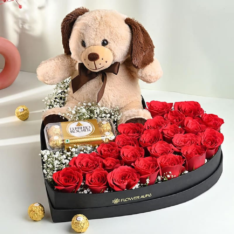 A luxury black heart-shaped box filled with red roses, Ferrero Rocher chocolates, and a cuddly teddy bear. Designed for grand romantic gestures like proposals and anniversaries.