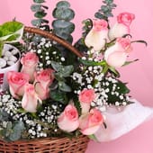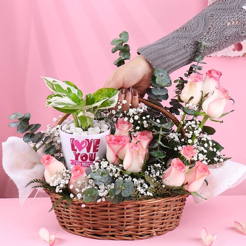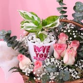 This charming floral arrangement is a perfect blend of beauty and affection. Featuring pink roses, delicate gypsophila, and lush eucalyptus, it exudes elegance and grace. At the heart of this bouquet sits a White Pothos plant in a white pot adorned with a sweet "Love You So Much" sticker. The combination of vibrant Valentine Flowers and greenery, nestled in a stylish basket, makes it an ideal gift for Valentine’s Day, an anniversary, or simply expressing heartfelt emotions. This thoughtful arrangement is designed to add a touch of love and freshness to any celebration of affection.
