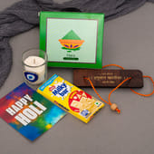 Celebrate Holi with this festive hamper, filled with sweetness, spirituality, and vibrant colours! Enjoy the creamy Milkybar, embrace the spiritual energy of the Hanuman Chalisa Wooden Book, and get into the festive mood with herbal gulaal in green. The Evil Eye Scented Candle brings protection and positivity, while the Holi Greeting Card adds a personal touch. Packaged beautifully in a charming basket, this hamper is perfect for gifting loved ones and making Holi even more special.