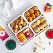 Make this Holi extra special with a delightful gift box packed with festive flavours. Inside, you'll find a perfect combination of Plain Gujiya, Kesar Chandrakala, and Mini Samosas, offering a sweet and savoury treat for everyone. The box also includes a Colour Box and Chandan Box, bringing traditional charm to your celebrations. All these festive delights are beautifully packed in a red gift box with a Holi greeting card, making it a wonderful gift to share the spirit of Holi with your loved ones.