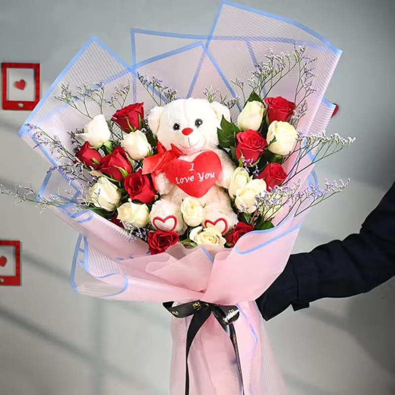 Celebrate love in the most delightful way with this enchanting bouquet featuring 18 vibrant red and white roses, symbolizing passion and purity, paired with an adorable "I Love You" teddy. Elegantly wrapped in premium pink-striped paper, this charming gift exudes elegance and affection. Perfect for Valentine's Day, anniversaries, or any occasion to express heartfelt emotions, this stunning arrangement is designed to bring joy, warmth, and a touch of romance to your loved one's day. A gift of love they'll always cherish!