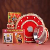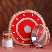 Grace blooms from every detail of this charming set featuring a lush jade plant nestled in a blossom pot with glossy pebbles. Accompanied by a traditional Karwa Chauth Thali set and a delightful mix of dry fruits, it captures the purity of rituals and the sweetness of love. Thoughtfully designed to symbolise prosperity and devotion, this elegant festive ensemble is a heartfelt gesture celebrating togetherness and blessings.