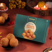 Emerald hues meet shimmering silver in green Gotta Patti Karwa Chauth thaali, framed with delicate lace. The set, adorned with shringar essentials, radiates grace and tradition, while the lotus diya holders add a glow of devotion. Rich desi ghee besan laddoos bring warmth and sweetness, perfectly paired with a signature dryfruit box that blends taste and nourishment. Every detail echoes the essence of Karwa Chauth—a day of love, strength, and togetherness, where partners honour their bond through prayer, tradition, and heartfelt offerings.