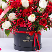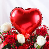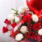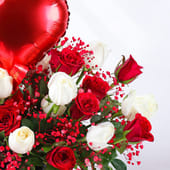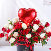 The perfect gift to celebrate love, this romantic bouquet features a stunning blend of 12 red and 12 white roses, elegantly arranged in a chic black round box. The addition of a shiny foil heart-shaped balloon enhances its charm, making it a delightful and heartfelt gift. Ideal for Valentine’s Day, anniversaries, or any occasion where love needs to be celebrated, this thoughtful arrangement is designed to captivate the heart. With its timeless beauty, this bouquet is a beautiful way to express affection and admiration, leaving a lasting impression that speaks louder than words.