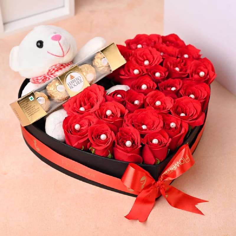 Here is a captivating floral box for you and your dearest to enjoy as well as confess your love to. Grab this gorgeous assorted floral box in the shape of a heart, that is decorated with red coloured roses, a pink hued teddy bear soft toy along with a pack of exotic chocolates Ferrero Rochers.