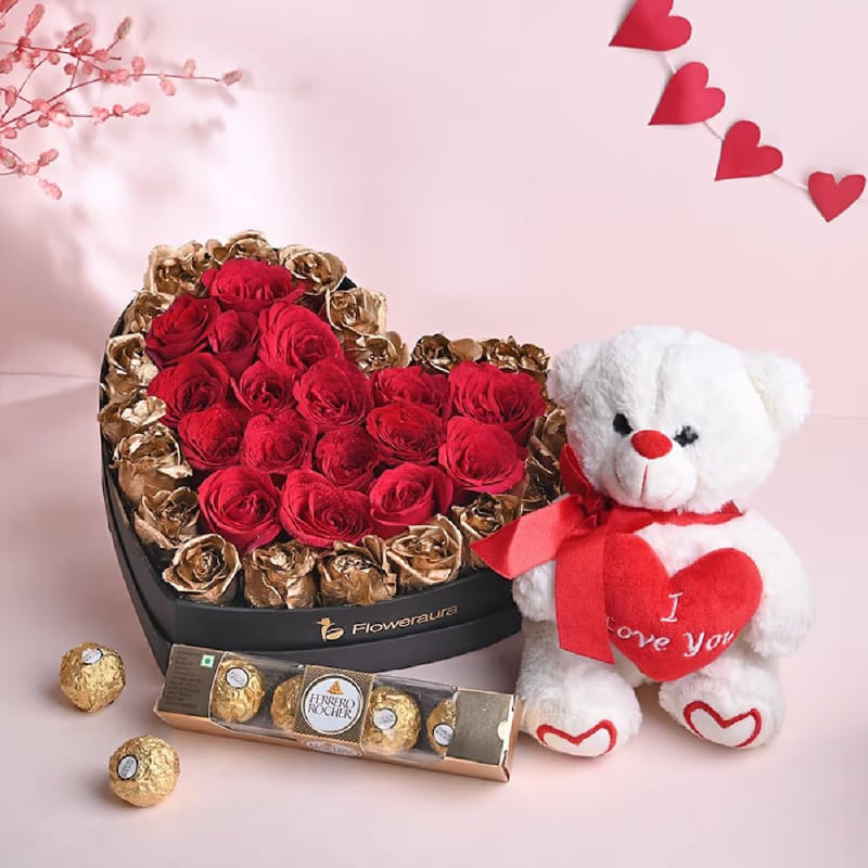Make your love bloom beautifully with this enchanting ensemble—a bouquet of 20 golden painted white roses and 15 deep red roses nestled in a black heart-shaped box. Adorned with an "I Love You" teddy, it's a symbol of affectionate devotion. Enhance the sweetness with a decadent Ferrero Rocher chocolate pack, adding a touch of indulgence to your heartfelt expression. This curated collection is a poetic celebration of love, blending the purity of white and the passion of red, enclosed in a charming box that speaks volumes.
