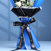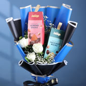 This striking chocolate bouquet is crafted to impress, pairing pure elegance with irresistible treats. White roses sit gently among soft fillers, setting a calm, romantic mood. Tucked within the premium blue and black wrapping are two gourmet delights: BK Almond Rocks and BK Hazelnut Rocks, adding a touch of indulgence to the display. It’s the perfect pick when you want something thoughtful yet delicious, offering the charm of flowers and the joy of fine chocolates in one beautifully designed gift.