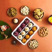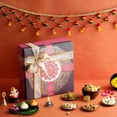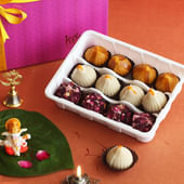 This festive hamper is a treasure trove of flavours, tradition & devotion. It features 12 pieces of assorted modaks in three indulgent flavours—Cashew Mango for a fruity richness, Cashew Rose for a nutty floral delight, and Classic Almond for timeless taste. Complementing these are Methi Mathris, a Ganesh idol, and a metal Aarti bell that brings sacred charm. Adding to the abundance is a vibrant Ganesh Potli filled with premium dry fruits—cashews, almonds, raisins, and pistachios. Thoughtfully curated, this hamper is perfect for sharing warmth & blessings during Ganesh Chaturthi celebrations.