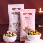 This set combines a lush money plant in a chic rose gold metal pot with two delightful snacks, making it the perfect gift for any occasion. The BBQ almonds offer a savoury, smoky crunch, while the Kalimirch cashews provide a bold, peppery kick. Four terracotta diyas complete the ensemble, adding a festive glow to create a warm, inviting atmosphere. Ideal for Diwali, Navratri, and other celebrations, this hamper beautifully blends nature's charm with mouth-watering flavours, all in one.