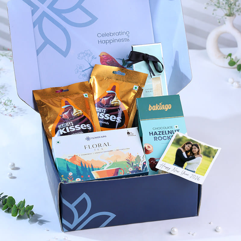 Ring in the New Year with a gift box that feels thoughtful, comforting, and full of charm. It brings together aromatic floral tea, rich choco hazelnut rocks, soothing jasmine–marigold fragrance notes, a cheerful polaroid keepsake, and a stylish blue bird box filled with sweet treats. Each element is chosen to spark joy, set a cosy mood, and make someone feel remembered as the year begins. Whether you’re gifting loved ones or marking your own fresh start, this hamper adds a gentle touch of celebration to the moment.