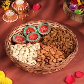 Celebrate the joy of togetherness with this festive basket of premium dry fruits, paired with hand-painted terracotta diyas. Thoughtfully curated, it blends health, tradition, and festive cheer in one beautiful gift. Whether you’re marking the lights of Diwali, the bond of Bhai Dooj, or sharing love on any special occasion, this hamper makes gifting meaningful and memorable. With the richness of cashews, almonds, and raisins, complemented by glowing diyas, it’s a heartwarming choice that spreads prosperity, sweetness, and light wherever it goes.