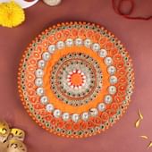 Bring home the festive spirit with this beautifully designed orange Thali paired with soft and syrupy Rasgullas. The Thali, adorned with intricate embellishments in vibrant hues, sets the perfect tone for the sacred rituals of the day, while the sweet Rasgullas add a delightful touch to the celebrations. Ideal for expressing love and gratitude towards the occasion, this set blends tradition and taste in one thoughtful gift. Make the occasion memorable with a keepsake that symbolises togetherness, blessings, and sweetness.