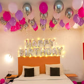 Step into a birthday setting that feels soft, radiant, and full of joy. Silver ‘Happy Birthday’ foil balloons glow gently against warm LED lights, creating a cosy focal point above the bed. The ceiling comes alive with a dreamy mix of silver chrome, pastel pink, purple, and magenta balloons, while matching balloons scattered across the floor complete the immersive look. Every detail blends elegance with playfulness, turning an ordinary room into a celebration space that feels intimate, cheerful, and picture-perfect for creating memories that linger long after the day ends.