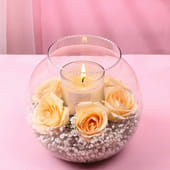Elegant and serene, this beautiful fishbowl arrangement features six delicate peach roses, nestled on a bed of soft fillers. A Rose & Black Oud candle sits in the centre, creating a tranquil and calming atmosphere. The 8-inch fishbowl adds a sophisticated touch, perfect for brightening any space. This timeless arrangement is ideal for gifting on occasions like Women’s Day, anniversaries, or simply to bring a moment of peace and beauty to someone's day. An effortless blend of fragrance, florals, and elegance, ideal for those who appreciate subtle luxury.