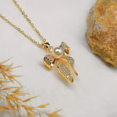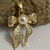 Add a touch of glamour to her jewellery box with this Elegant Bow Design Gold Pendant. The pendant features a lustrous pearl at its centre, surrounded by sparkling crystals that radiate sophistication. The delicate gold chain perfectly complements the design, offering a refined and timeless look. Ideal for gifting on special occasions such as birthdays, anniversaries, or simply buy it for yourself, this pendant is sure to feel cherished. A beautiful piece that blends elegance with charm, making every moment even more special.