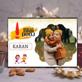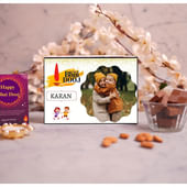 Celebrate Bhai Dooj with a sweet gesture that beautifully blends love and indulgence. This 6-piece box of rich and creamy handcrafted chocolates is designed to melt in every bite and warm the heart. What makes it truly special is the personal touch – customise it with your brother’s name and photo to turn it into a memory he’ll treasure. Paired with a festive greeting card, this thoughtful hamper adds charm to the occasion, making your sibling bond even sweeter and unforgettable.