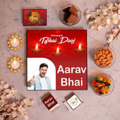 Make Bhai Dooj sweeter with a luxurious box of 25 rich and creamy handcrafted chocolates, beautifully curated to melt hearts and taste buds alike. Each piece carries the touch of indulgence, crafted with finesse for moments worth remembering. What sets this hamper apart is its personalised charm – add your brother’s name and photo to make it uniquely his. Paired with a festive greeting card, this premium box blends tradition with elegance, turning a simple treat into a cherished keepsake of sibling love.