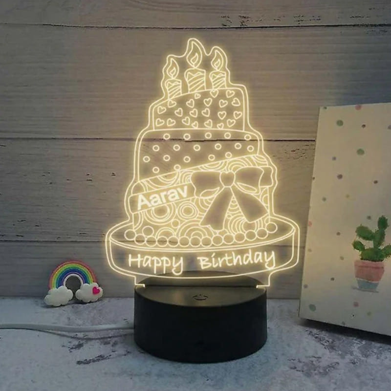 This Personalised 3D Illusion Birthday Cake LED Lamp is the perfect addition to any birthday celebration. Featuring a beautifully detailed 3D birthday cake design with candles, hearts, and a bow, it can be customised with a name and a "Happy Birthday" message. The lamp is equipped with a multicolour LED base, allowing you to choose from a range of vibrant colours to create the perfect mood. This unique night light serves as both a decorative and functional gift, making it an unforgettable birthday surprise. Illuminate their special day with a personalised touch!
