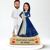 This charming caricature showcases a couple dressed in traditional Indian attire, adding a cultural flair to any space. The playful yet heartfelt message, "Your Smile Makes Me Smile," makes it a perfect keepsake for weddings, anniversaries, or special celebrations. Crafted with care, this personalized decor piece brings a warm, fun, and loving touch to any home or office, making it a constant reminder of cherished moments and shared smiles. Whether as a keepsake or a unique decor piece, it celebrates love in a fun and memorable way, serving as a constant reminder of shared happiness.
