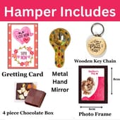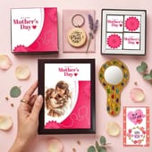 Here’s a thoughtful Mother's Day hamper that blends sweetness with sentiment. It includes a box of decadent chocolates, a personalised photoframe to cherish precious moments, a beautiful decorative mirror for a touch of elegance, a charming keychain for everyday love, and a heartfelt greeting card to express your emotions. This gift set is the perfect combination of love and memories, making it an ideal way to show your appreciation and make her day even more special.