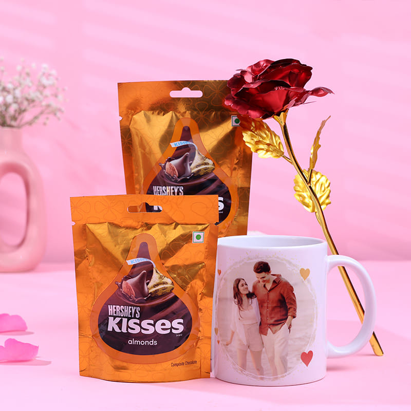 Celebrate love and affection with this sweet and thoughtful gift. The personalised ceramic mug, featuring a custom photo, is perfect for enjoying cozy moments together. Paired with two packs of Hershey’s Kisses with almonds, this set brings sweetness and joy to any occasion. Ideal for Valentine’s Day, anniversaries, or any romantic moment, it’s a gesture that speaks straight to the heart. Whether it's morning coffee or an evening treat, this gift will remind them of your love every day.