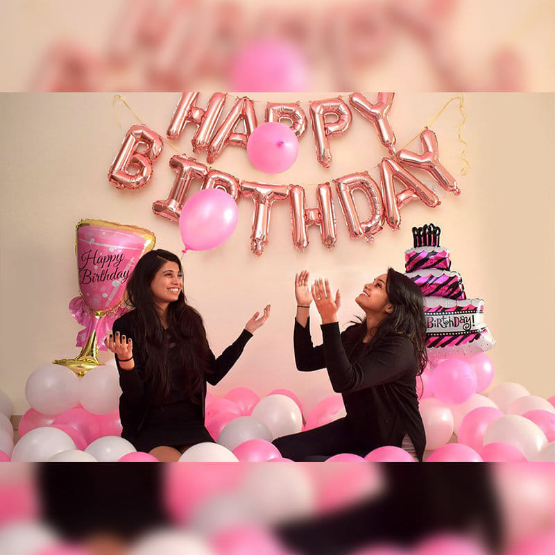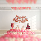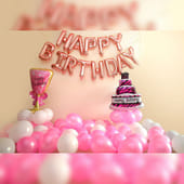 Elevate your birthday celebration with our Pretty Pink & Rose Gold Birthday Decor. This stunning decoration package includes 30 pink and white latex balloons artfully affixed to the ceiling with tape and ribbons, creating a mesmerizing visual display. Additionally, 20 balloons adorn the floor, adding an extra touch of charm. The ensemble features a Happy Birthday foil balloon, a birthday cake-shaped foil balloon, and a champagne glass-shaped foil balloon, all adding a festive flair. Our expert decorators will transform your chosen location into a birthday wonderland, ensuring a memorable and hassle-free celebration. Let us take care of the decor while you enjoy your special day!
