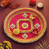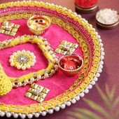 A blush of pink meets the warmth of yellow in this charming festive Thali, where delicate motifs embrace tiny compartments for Kumkum, rice, and sweets. The glossy accents and intricate patterns catch the light, creating a joyful shimmer that brings every celebration to life. A diya rests at the centre, casting a golden glow that radiates warmth and cheer. Perfect for festive rituals or as a thoughtful decorative piece, this Thali captures the spirit of togetherness, laughter, and heartfelt moments, adding a touch of tradition and charm to any joyous occasion.