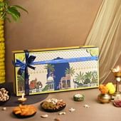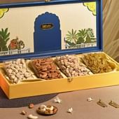 Elegance meets tradition in this festive dry fruit box, crafted to bring richness and warmth to every celebration. The beautifully designed box opens to reveal four compartments filled with cashews, almonds, raisins, and pistachios. They are perfect for healthy snacking or festive indulgence. The vibrant presentation, inspired by cultural motifs, makes this box an ideal gift for Diwali, weddings, or any joyous occasion. Thoughtful, luxurious, and wholesome, this box is more than a treat—it’s a gesture of love, prosperity, and festive cheer shared with family and friends.