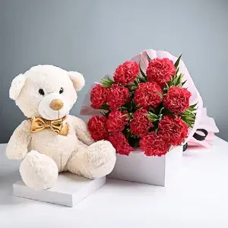 In a splendid display of nature's artistry, behold the enchanting allure of our carnation bouquet. Twelve exquisite pink carnations, delicate and alluring, are carefully arranged and wrapped in a light pink cellophane wrap, radiating an aura of elegance. As you gaze upon this breathtaking creation, let the velvety petals of the carnations transport you to a world of romance and passion. Accompanying this floral masterpiece is a charming teddy bear, a symbol of warmth and affection, adding an extra touch of sweetness to this poetic ensemble. Allow the beauty of these blooms and the love they represent to create a moment of pure indulgence and delight.