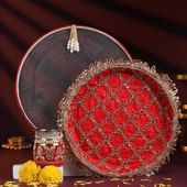Make Karwa Chauth truly special with this complete ritual set, designed to honour every tradition with grace. The red decorative thali and matching sieve add festive elegance, while the Vrat Katha book and calendar guide the prayers with devotion. Essentials such as Sindoor, Mehndi cone, designer Bindis, and a steel glass ensure authenticity, while the lotus-shaped Roli Chawal container enhances the ceremony’s sacredness. A tealight candle glows warmly, bringing charm and serenity to the occasion.
