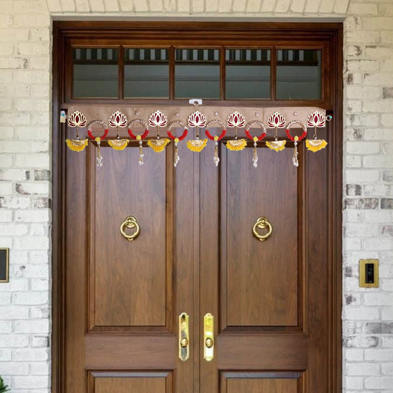 Elevate your festive decor with this exquisite designer Toran, crafted to reflect elegance and tradition. Featuring intricate lotus motifs in radiant gold and red, paired with delicate embellishments, it brings a divine touch to any space. The combination of bright yellow and red accents creates a vibrant look, symbolising prosperity and positivity. Designed to adorn doorways, Mandirs, or walls, this Toran is perfect for Diwali, weddings, or housewarming ceremonies.