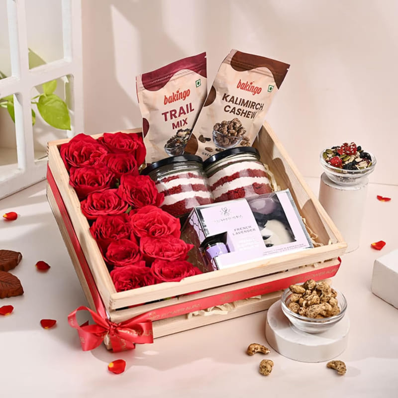 Unwrap a delightful blend of elegance and indulgence with this festive hamper! The vibrant beauty of 12 red roses sets the tone for a celebration filled with love. Satisfy your sweet cravings with two decadent red velvet jar cakes! Indulge in the rich flavour of Kalimirch Cashews and the crunchy Trail Mix for a savoury treat. To complete the experience, a soothing French Lavender Reed Diffuser fills your space with a calming aroma. This hamper brings together the perfect balance of beauty, taste, and relaxation, making it ideal for gifting on special occasions like Karwa Chauth.