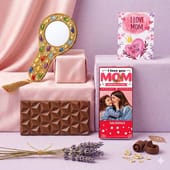 Celebrate the special bond with your mom this Mother's Day with a thoughtfully curated hamper. This beautiful set includes a personalised chocolate bar wrapped in a heartwarming Mother's Day-themed photo print, an intricately stone-engraved hand mirror to add a touch of elegance, and a sweet greeting card that carries your warm wishes. A perfect way to express love and appreciation for the most important woman in your life. Whether it's for a surprise or a gesture of affection, this hamper is sure to bring a smile to your mom's face.