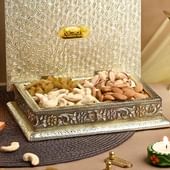 Graceful and luxurious, this dry fruit box is a perfect blend of tradition and elegance. The silver-toned case is intricately designed and opens to reveal cashews, almonds, raisins, and pistachios. Each dry fruit is carefully selected for its taste and quality, offering nutty richness, natural sweetness, and wholesome goodness in every bite. The ornate box enhances its festive appeal, making it not only a treat for the taste buds but also a keepsake to treasure. Ideal for Diwali, weddings, or special occasions, this gift carries prosperity, health, and love wrapped in timeless sophistication.