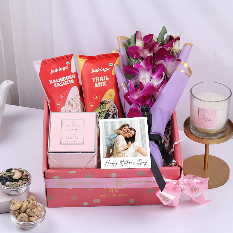 This thoughtfully curated gift set is designed to make Mother's Day truly special. It features a soothing Rose & Black Oud candle, filling her space with calming fragrance, and two elegant purple orchids that add a touch of beauty. Wrapped with care, the open tray holds a heartfelt Polaroid photo, capturing a cherished moment together. The set also includes Kalimirch Cashews and Trail Mix for a delicious treat, making this the perfect way to celebrate and pamper the wonderful mother in your life. A beautiful blend of love, beauty, and indulgence.