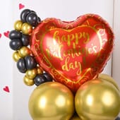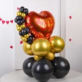 On a day when hearts beat in harmony, picture a decor crafted from the gleam of golden chrome and the elegance of black latex balloons, setting a scene of sophisticated romance. At the centrepiece, a heart-shaped balloon proudly declares "Happy Valentine's Day," its foil surface catching the light with every flutter. Complementing this loving message, a carefully arranged bunch of golden chrome and black balloons stands by the side, like a loyal companion to the heart's declaration. This beautiful arrangement captures the essence of Valentine's Day, blending the allure of gold with the mystery of black to celebrate love in style.