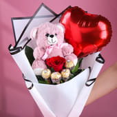 This adorable gift combo is perfect for showing your love and appreciation. It features a soft purple teddy bear, a single fresh red rose, and a delightful pack of Ferrero Rocher chocolates. The gift is beautifully presented with a heart-shaped foil balloon and premium paper wrapping, making it ideal for any special occasion like anniversaries, birthdays, or Valentine's Day. With its thoughtful mix of sweetness, charm, and elegance, this is the ultimate gesture to brighten anyone’s day. A perfect blend of cuddly, sweet, and festive!