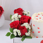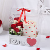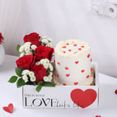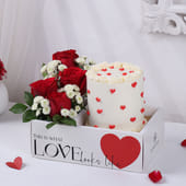 The perfect combination of elegance and sweetness, this gift set features a beautiful arrangement of red roses accented with delicate white gypsophila. Paired with it is a tall vanilla cake, adorned with heart-shaped details, making it a delightful treat for the senses. Presented in a chic box with the phrase "This is what love looks like," it’s a beautiful way to express affection. Whether for a special occasion like Valentine’s Day or just to surprise someone you love, this thoughtful set is sure to create a memorable moment.