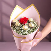 This beautiful chocolate bouquet holds the kind of attention that doesn’t need grand gestures to feel sincere. A single red rose stands at its heart, carrying warmth and meaning, while the Ferrero Rochers around it add a sweet, golden glow that instantly lifts the mood. The delicate fillers soften the overall look, and the pink premium paper, with its gold border, wraps everything in a touch of elegance. As a gift, it whispers thoughtfulness, making it perfect for moments when you want someone to feel cherished, appreciated, or simply surprised in the loveliest way.