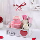 A charming way to express love, this delightful hamper features two elegant pink roses, two pure white roses, and a delicious strawberry bento cake. Wrapped in a clear gift box with the heartfelt message, "This Is What Love Looks Like," it's the perfect token of affection for special moments like Valentine's Day and more. The delicate blooms symbolise both grace and purity, while the irresistible bento cake adds a sweet touch to this beautiful gesture. It is a thoughtful way to create unforgettable memories with your loved one.