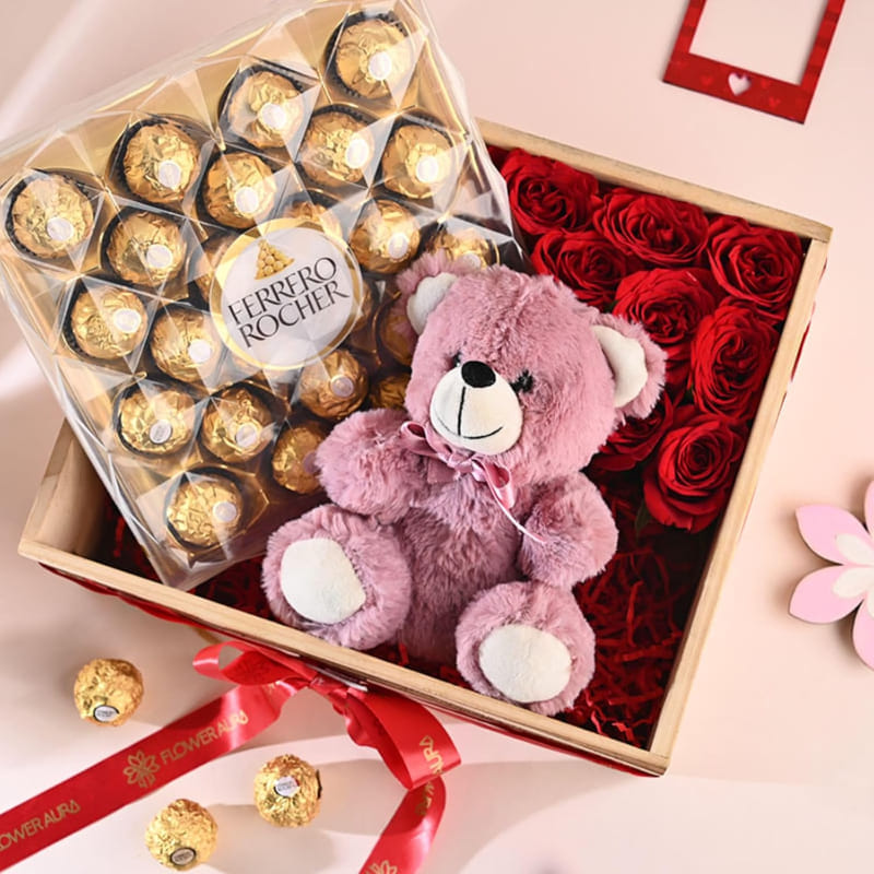 Celebrate love with this delightful hamper featuring decadent Ferrero Rocher chocolates, a cuddly plush teddy, and radiant red roses, all elegantly arranged in a wooden basket. Perfect for Valentine's Day, Rose Day, or any special occasion of love, this gift is a heartfelt way to express your deepest emotions. The combination of luxurious chocolates, a charming teddy, and timeless roses makes it an unforgettable surprise for your special someone. Let this hamper convey your love with style and sweetness!