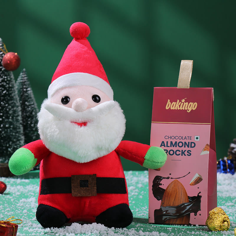 Bring festive joy with this delightful Christmas combo, featuring a cute Santa Soft Toy and a box of Bakingo’s irresistible Chocolate Almond Rocks. This gift is perfect for spreading holiday cheer. The Santa Soft Toy adds a touch of magic to any celebration, while the rich, velvety chocolate-coated almonds provide a treat for the taste buds. Ideal for gifting friends, family, or colleagues, this charming combo is the perfect way to share warmth and sweetness this Christmas.