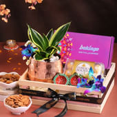 This thoughtfully curated hamper exudes elegance and festive charm. It includes a premium assortment of baked delights with a luxurious dry fruit box and Ferrero Rocher chocolates. A stylish metal pot houses a MILT Sansevieria plant, symbolising strength and growth, while a beautiful blue orchid and fresh white daisy add a refreshing pop of colour. The wooden tray beautifully ties everything together in a rustic, charming way. Perfect for celebrating Diwali, Bhai Dooj, housewarmings, and other joyous occasions, this hamper is a beautiful gesture of love and warmth.