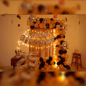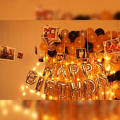 Experience the epitome of birthday extravagance with this exquisite Balloon Decor. Crafted for moments filled with joy, this enchanting setup features 'Happy Birthday' letter foil balloons paired with a stunning ensemble of 200 golden, black, and silver balloons. The fairy light, casting a warm glow, elevates the ambience, while four star-shaped foil balloons introduce an extra layer of elegance to this arrangement. The two golden frill curtains serve as the perfect backdrop, creating the ideal setting for unforgettable memories to unfold during the birthday celebration.