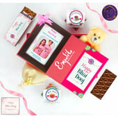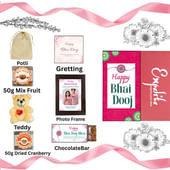 A Bhai Dooj hamper designed to fill your sister’s day with joy, sweetness, and warmth. The set includes a chocolate bar wrapped in festive Bhai Dooj packaging, offering a taste experience like no other. A cuddly teddy with a “Best Wishes” heart adds a touch of cuteness and love. The personalised photo frame holds a cherished memory, turning the gift into a keepsake. Healthy yet flavourful treats like mixed fruit bites and tangy cranberries bring both taste and goodness. Completed with an elegant jute potli and a heartfelt greeting card, this hamper makes celebrations unforgettable.