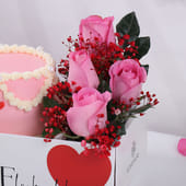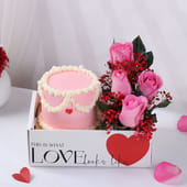 Tickle your soulmate's heart with this enchanting gift set, featuring a delightful arrangement of pink roses and a mouthwatering strawberry-flavored tall cake. The roses, with their soft pink petals and delicate red accents, create a romantic aura, while the cake, adorned with a string of little swirls and cute hearts, promises a sweet indulgence. Presented in a beautiful box with the message "This is what love looks like," this thoughtful combination is the perfect way to express your deepest affection and create unforgettable memories.