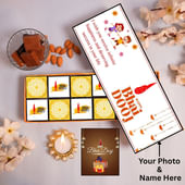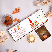 A vibrant orange box glows with festive charm, adorned with golden motifs, diya patterns, and the Bhai Dooj emblem at its heart. Inside, rows of neatly wrapped chocolates carry intricate mandala-inspired designs and blessings of “Happy Bhai Dooj,”. A matching greeting card rests within, adding words of love to the celebration. Bhai Dooj is a moment where sisters pray for their brothers’ long life and happiness, and brothers promise lifelong care. This hamper captures that sacred bond, making the occasion sweeter, warmer, and filled with cherished memories.