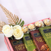 Indulge in an irresistible symphony of flavours that blend creamy chocolate with a delightful crunch. Rich, velvety rum & raisin paired with the smooth elegance of almond treat bars makes every bite a luxurious experience. The Ferrero Rocher adds a touch of golden sophistication, while the delicate white roses enhance the charm of this stunning gift. Carefully presented in a beautiful open tray, adorned with soft fillers, this collection is a perfect gift for romantic occasions, anniversaries, or simply to surprise someone special with a sweet, thoughtful gesture.